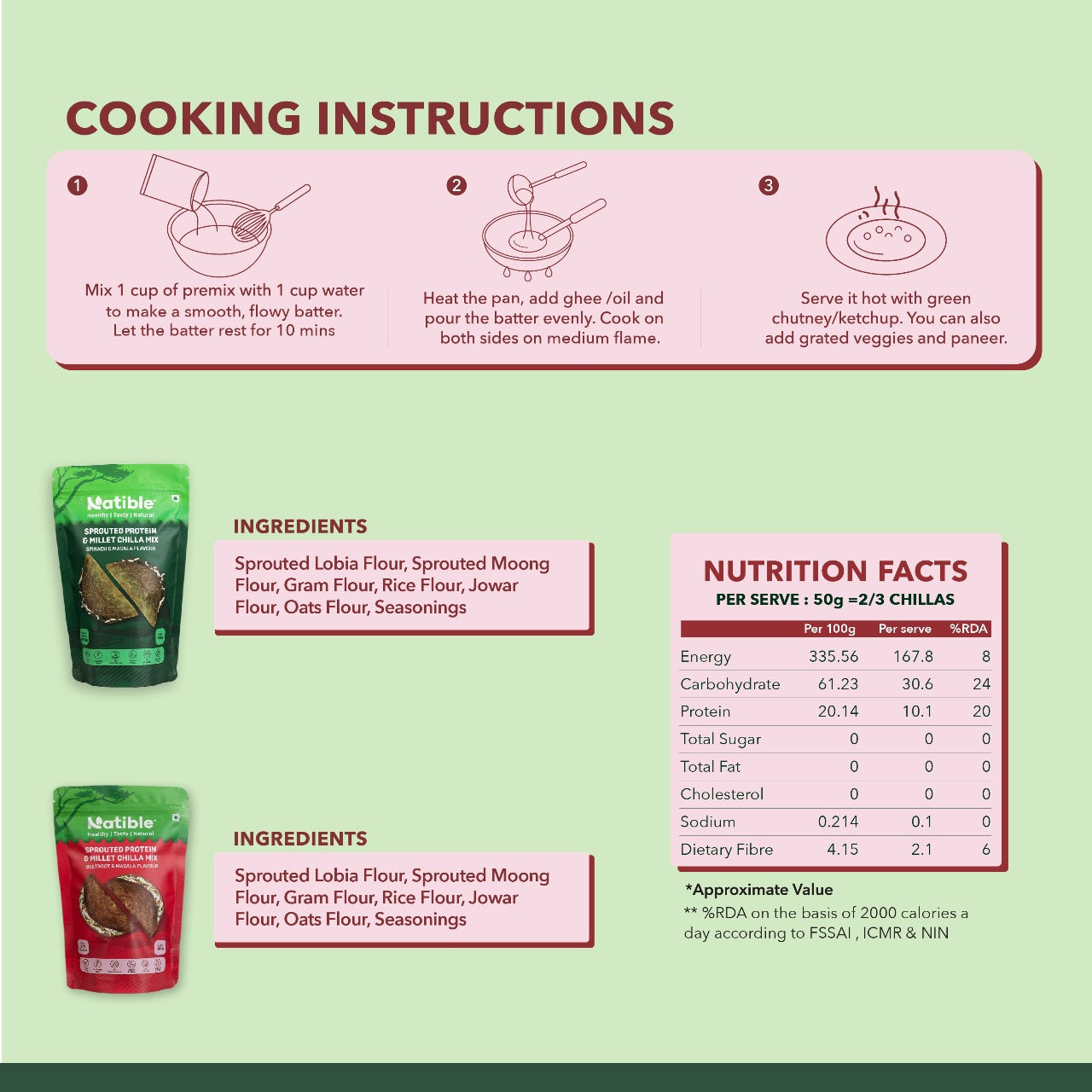 Natible's instant chilla dosa mix is crafted with sprouted lentils, millets, and oats—no rice included! This plant-based mix is rich in protein, gluten-free, and easy to digest, making it a gut-friendly Preservative-Free Snack for kids and adults.