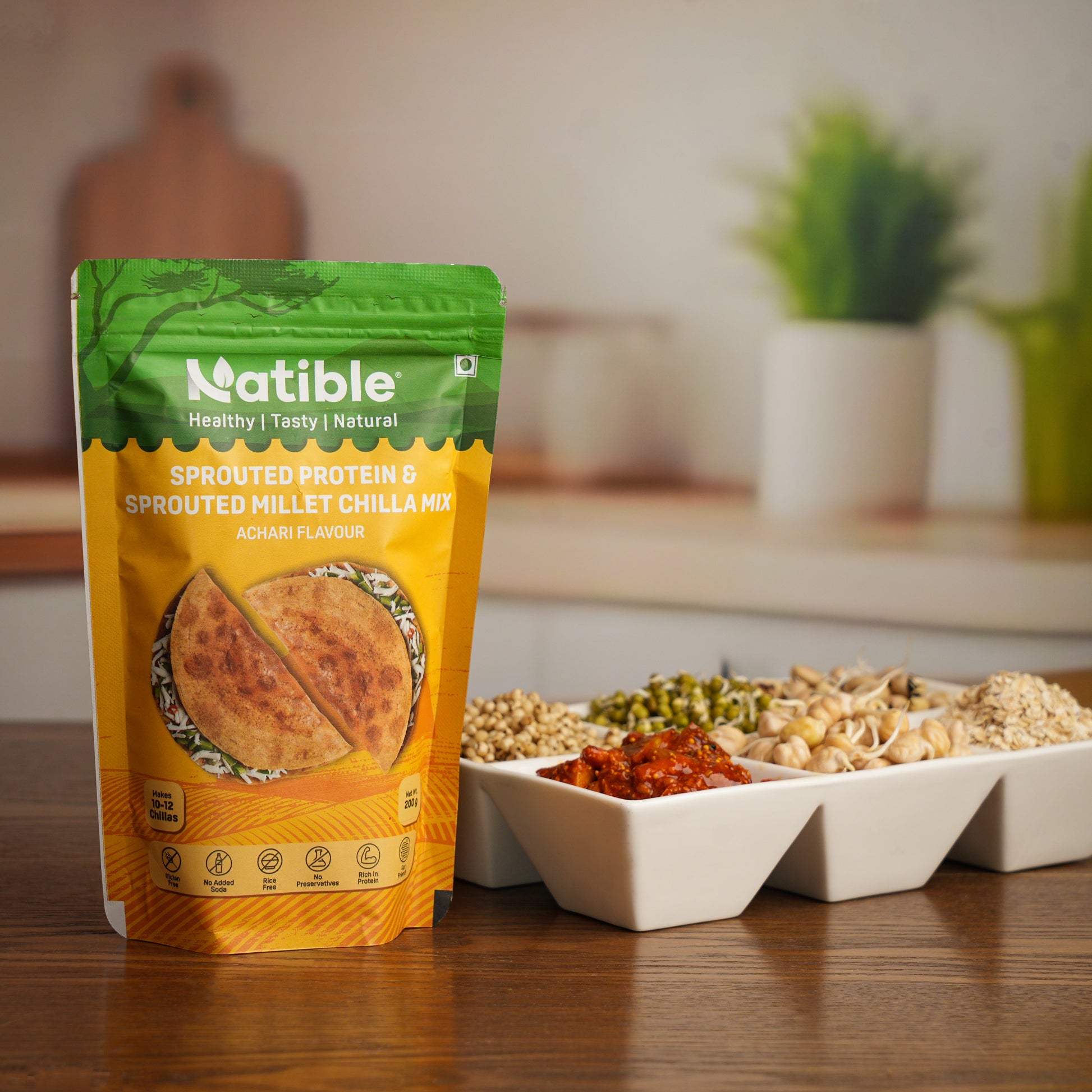 Elevate your snacking and meal prep with Natible’s Achari Sprouted Protein and Millet Chilla Mix—a flavorful, wholesome option for health-conscious individuals seeking convenience and taste!